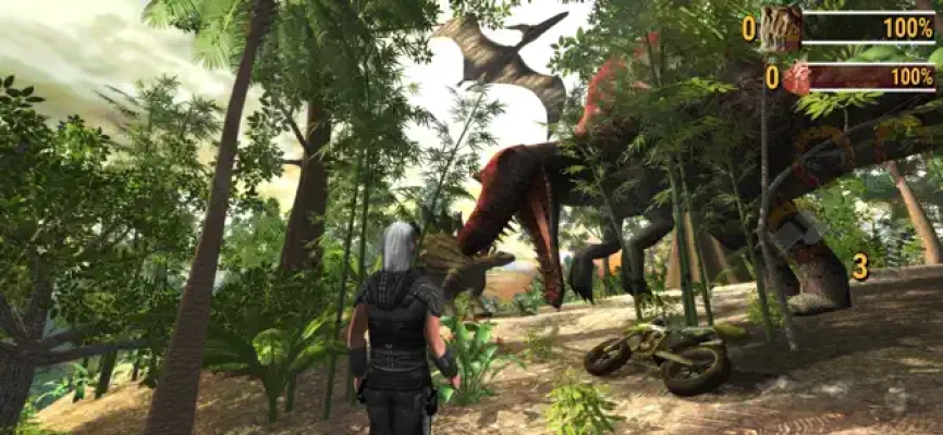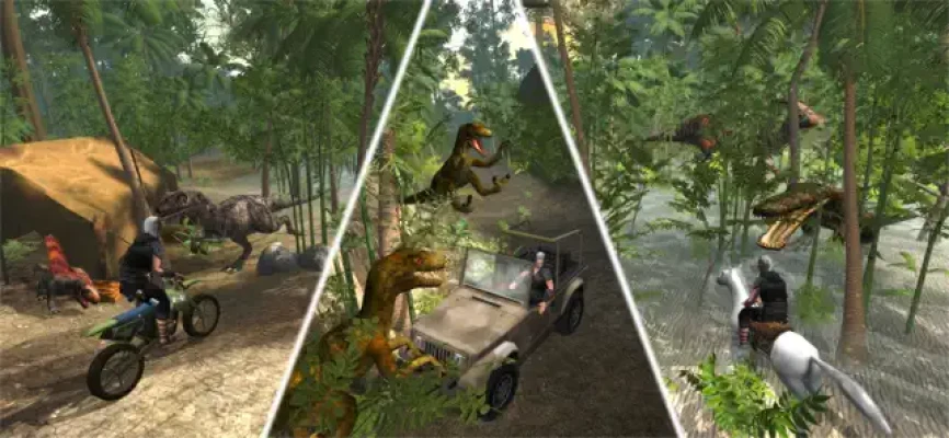 Travel by Motorbike you can Somersault off the bike to be right in the middle of the action, Sniper rifle long range kills from within your 4x4 Off-Road Vehicle, ride by Boat or maybe you prefer to run in and out of the action by foot, your faithful friend - Horse can be called by your whistle to get you out of those tight dino situations.