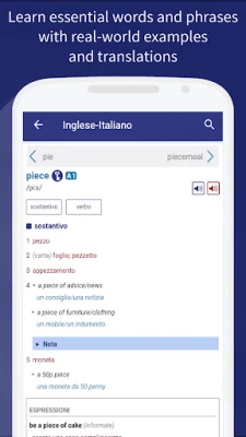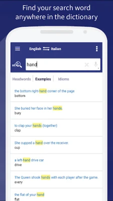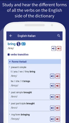• Search for the word you want in either English or Italian, and switch dictionary sides with one tap