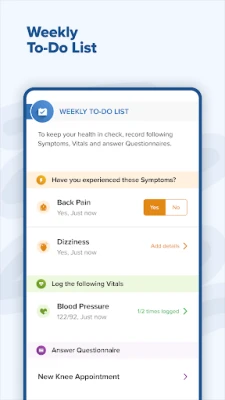 • Symptoms, Vitals, and Lifestyle Tracking - easily track your Symptoms like pain, nausea and more - with follow on questions like your doctor would ask, as well as Vitals like Blood Pressure, Weight, Sleep, etc. - to assist with diagnosis, treatment, post-surgical care, and recovery.