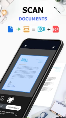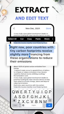 This doc scanner app includes optical character recognition (OCR) to scan text in images or PDF files. After extracting text from images or PDF files, you can edit, and save as a PDF.