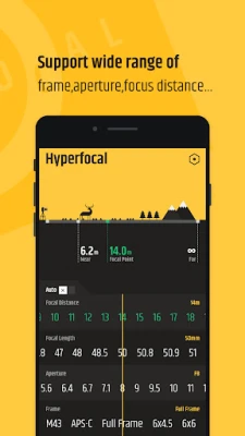 1. After manually setting the frame, aperture and lens focal length, it can automatically determine the focus distance of the hyperfocal distance, and identify the depth of field near limit and far limit (infinity).