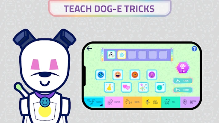 Train your Dog-E to do tricks using the app. Using simple sequential programming, practice STEM skills by creating your own trick with up to 6 sequences. The Trick Maker includes 44 different sequences that you can use to build custom tricks, including emotes, light shows and motion. You can save up to 4 custom tricks for each Dog-E profile you have.
