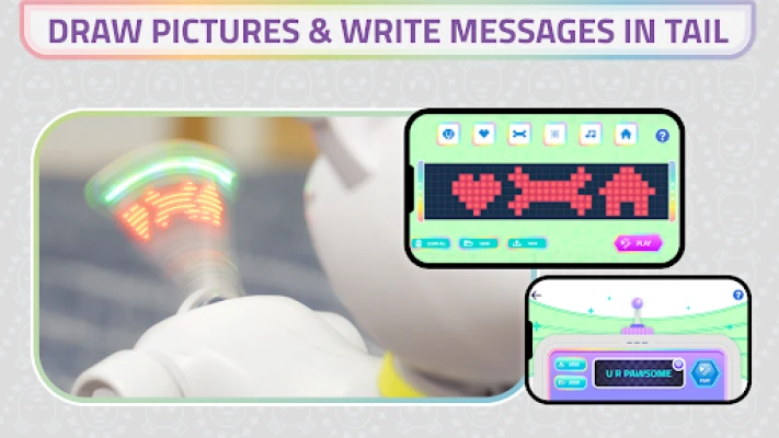 Using innovative persistence of vision (POV) technology, Dog-E can communicate with you using its tail. Use the Dog-E App to write custom messages that will play in Dog-E’s tail. You can also draw pictures! Save up to 4 custom tail creations in each Dog-E profile you have.