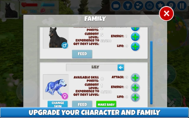 To survive in the forest, you need to use all the possibilities! Obtain experience by performing tasks, defending yourself against other animals and collecting food. Having received a level, the character can spend experience on attack points, energy or life. There are also special skills that allow you to increase the speed of the animal, collect more food, get more resources for actions in the game, etc.