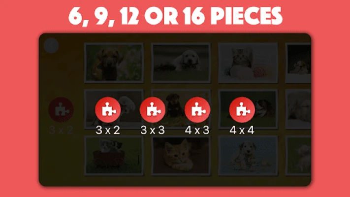 - Challenge yourself with 9 different puzzle sizes: 6, 9, 12, 16, 20, 30, 56, 72 and 100 pieces and 3 different puzzle backgrounds