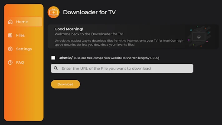 You can use our free companion URLSRT.IO URL shortener and enter only the generated alias to download files. This greatly helps you save your time and effort. Downloader for TV can also be used as a mini File Manager app, as you can view the downloads under the Files section.