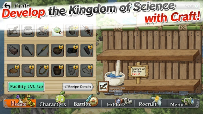 Use items and materials earned in order to level up the facilities in the Kingdom of Science!
