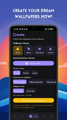 • Unlimited wallpaper creation – Unleash your imagination with original, fully customizable designs powered by advanced AI.