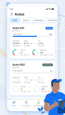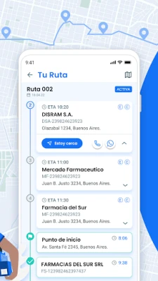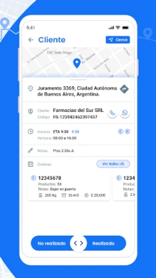 La aplicación te muestra la ruta asignada, el listado de clientes a visitar y el orden óptimo de visita para cumplir con los horarios de entrega. También puedes acceder al navegador para llegar al próximo cliente, ver cuántos clientes te quedan por visitar e informarles cuando estés cerca a través de llamadas o mensajes de WhatsApp.