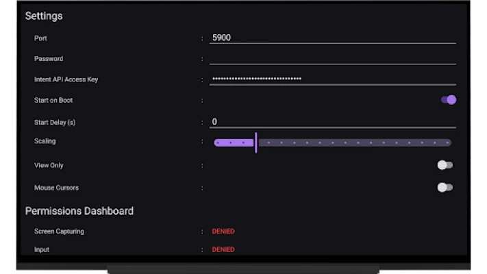 - Remote Control: Use your VNC client to control your device, including mouse and basic keyboard input. To enable this, you must activate the Accessibility API Service on your device.