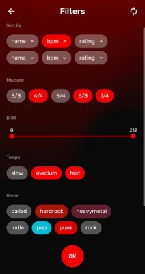 You can sort beats by: BPM, type (ballad, hardrock, heavy metal, indie, pop, punk), tempo and other. If you want - choose your favourite tracks and make your own list.