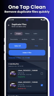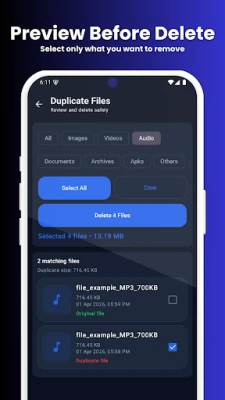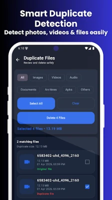 Free up storage space by removing duplicate photos, videos, audio, and other files in just a few taps.