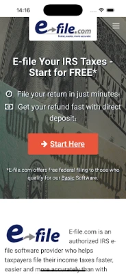 E-file.com is a U.S. based company offering products and services related to the preparation of U.S. federal and state tax returns, the Platform is intended for U.S. taxpayers only. E-file.com is not part of any government agency including but not limited to the IRS. You may reach the IRS website at https://www.irs.gov. E-file.com does not market to children under the age of thirteen (13) (“Minimum Age”) or subjects of other countries including those in the European Economic Area. Please review E-file.com's terms of service (https://www.e-file.com/usage-terms.php) prior to installing this app.