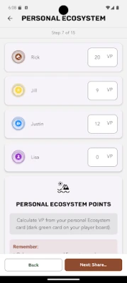 - Step‑by‑step scoring wizard: Walk through every phase—Base Victory Points, Events, Compost, Sprouts, Growth, Terrain cards, Personal & Public Ecosystem objectives, Fauna objectives, Tableau bonuses, and Final Score—without missing a beat.