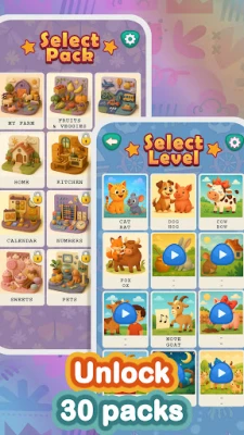 The riddle images are spread into level packs, covering different topics. Thus this educational app can help toddlers learn the spelling of fruits and vegetables, plants and animals, clothing and furniture, etc. Download this learning game for kids for free, play dozens of levels with cute animals, and unlock more image packs if you like.