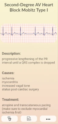 After learning to read an ECG, you can scroll down and learn the causes of that abnormality and the situations where it arises. You'll also learn the medical treatments and complications.