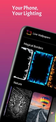 The Border Color Light - Rounded Corner for All Device App brings a unique and appealing lighting experience to your mobile screen. You can even change your live screen wallpaper and set your own image background for a personalized touch.