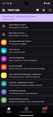 Early Learning Ventures Parent & Pickup Mobile App Is used by both parent/guardians of childcare providers, and non-parent/guardians, that are using Early Learning Venture's Alliance CORE system.