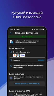 Получаваш същите услуги, с които си свикнал, пазарувайки от eMAG: бърза доставка, удължена гаранция, наложен платеж или плащане онлайн, 30 дни право на връщане и проверка на пратката преди заплащане. Също така, в твоя акаунт на eMAG апликацията винаги имаш на разположение историята на твоите поръчки и фактури, гаранции, списък с любими продукти, както и информация за данните за фактуриране.