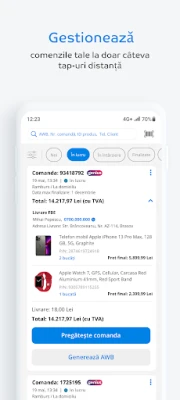 - Dashboard-ul cu starea generala a contului, pentru a monitoriza vanzarile si a-ti contura cea mai buna strategie pentru afacerea ta. Vei putea vedea usor la ce nivel sunt indicatorii de sanatate a contului pentru a interveni rapid in cazul in care nu sunt la un nivel optim. - Ofertele tale, pentru a cauta rapid in portofoliul tau detaliile de care ai nevoie. - Comenzile primite, cele in lucru sau cele finalizate, pentru a sti in permanenta statusul lor. Poti vedea detaliile fiecarei comenzi si poti modifica statusul - Generare AWB – direct din aplicatie, pentru comenzile pe care vrei sa le procesezi din telefon. - Un sistem de scanare a produselor, in timp ce pregatesti comanda, ca sa fii sigur ca nu ratezi niciun produs comandat de clienti.