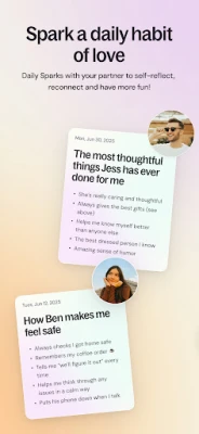 Sparks are prompts for you both to answer a question on the app. It keeps the energy alive with spontaneous, bite-sized prompts designed to surprise, delight, and get you talking in new ways. Each spark is tailored to your relationship, turning everyday moments into chances for connection, laughter, and intimacy.