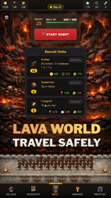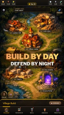 Gather resources, expand your settlement, and prepare your defenses during the day. At night, survive escalating enemy waves in high-pressure wall battles.