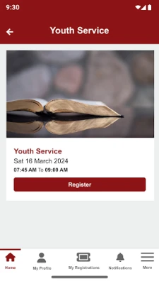 1. **View/Register for Events**: Stay connected with our vibrant community by browsing and registering for upcoming events. Whether it's a worship service, a teaching session, or a special ministry event, you can easily view details and secure your spot with just a few taps.