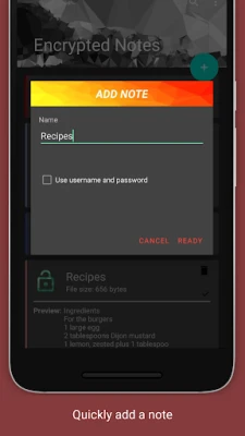 This app provides an easy way to keep your notes protected. You can individually choose for every single note to either lock it by password, fingerprint or to keep it unlocked.