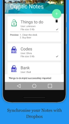 The app saves the contents of your password-protected notes in encrypted form on your smartphone, using the Advanced Encryption Standard (AES) with a 256 bit key length (valid for app version 3 and upwards). This standard is authorized for documents of highest confidentiality by the U.S. government. Once you open the note by authenticating yourself, the app converts the note back into readable text. You can then view and edit its content again. Do not forget your password though, as there is no way to access a password protected note without the correct password. You also have the option to automatically synchronize your notes with your Dropbox account, making usage of the app over multiple devices possible. To use the fingerprint feature, you must pay a one time fee.