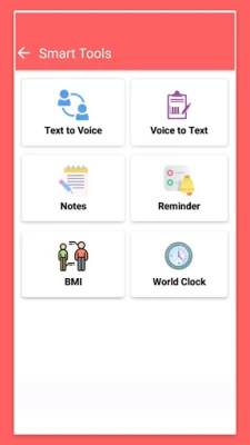 7) Smart Tools - Text to voice, voice to text, Notes, Reminder, BMI and World Clock