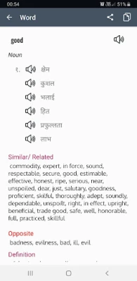 This app has more than 50000 words, phrases & Quotes. Meaning of words are providing definition, similar/related(synonyms), opposite(antonyms), word usage, example sentences.