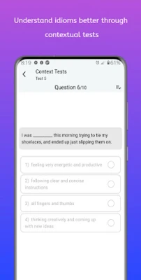 Interactive Tests: Challenge yourself with two types of tests—context tests and meaning tests—to ensure you understand how to use idioms correctly.