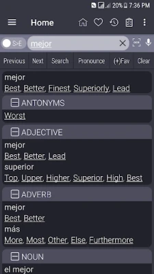 • Integrated with Other Apps: Use the dictionary directly from your browser or other applications via the sharing option. Select "Spanish Dictionary" from the sharing menu, and it will open with the shared word—no need to type! After use, you’ll return to your previous app.