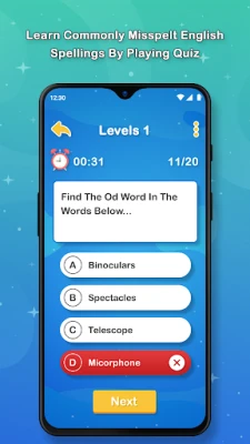 This free English spelling Quiz app will test your spelling skills and also will help you to learn commonly misspelled English spellings.