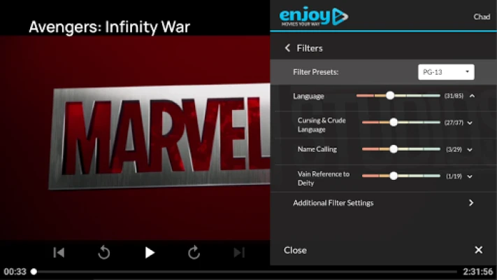 Violence and nudity filters are also available for a growing library of thousands of fully tagged shows. In addition to language, violence, and sexual content, Enjoy can also filter drugs, alcohol, and a dozen other potentially triggering themes (like bullying, suicide, disturbing images, etc.). It can mute the sound, skip sections entirely, and black out or blur the video.
