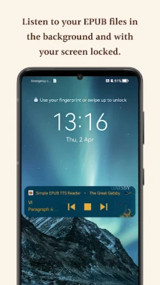 Import your EPUB books and listen to them using your device's built-in text-to-speech engine - in the background, with your screen locked, just like a podcast or audiobook app.