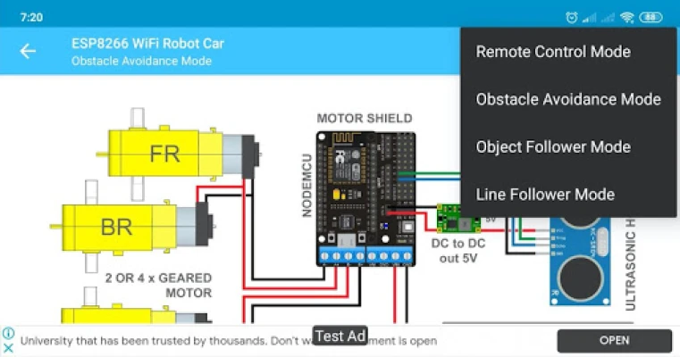 Features: - Simply remote control interface - Upload firmware via USB OTG or WiFi OTA directly from Android phone - Remote control mode - Obstacle avoidance with servo mode - Line follower mode - Object follower mode - Available Arduino source code
