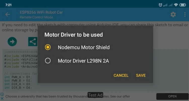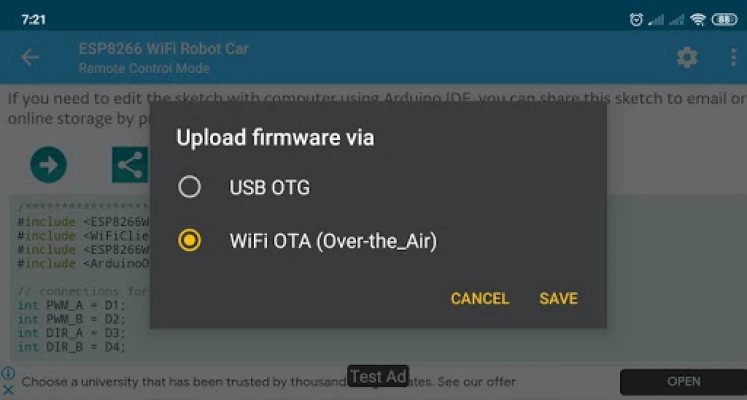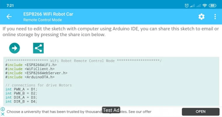 This app is designed to make it easy for you to build a basic Wifi robot car. The app allows you to control an ESP8266 based robot car over Wifi (on AP/STA mode), and also you can upload Arduino sketch/code directly from your Android phone to ESP8266 via USB OTG or Wifi OTA (Over-theAir).\n\nPlease be advised that this app contains ads and potential in-app purchase to improve next app development.