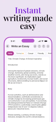 Writing essays can be challenging, especially when deadlines are tight or when you’re struggling to put your thoughts into words. That’s where Essay Writer AI comes in. Built with advanced artificial intelligence, the app understands your prompts and delivers clear, structured, and original essays in just a few seconds.