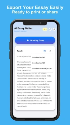 Save your generated essays directly to your device in multiple formats: