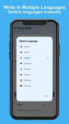 EssayMate supports many languages, allowing you to generate essays for international assignments, language learning, or global writing needs, like: English, German, French, Danish, Finnish, Dutch and many more!