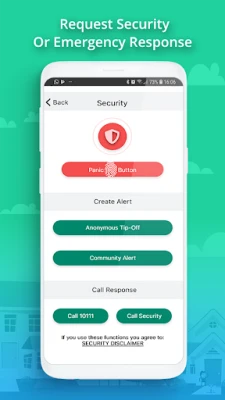 • The security button can be pressed to request immediate security response with your location, or you can send a community alert, or an anonymous tip off.