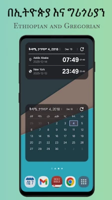 - Daily Glance: Beautiful, customizable widgets placed show today's Ethiopian and Gregorian dates immediately. In addition, you can see clocks for two cities at the same time, which is an important feature for diasporas