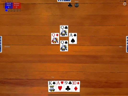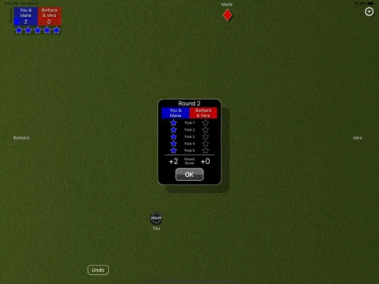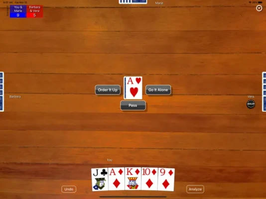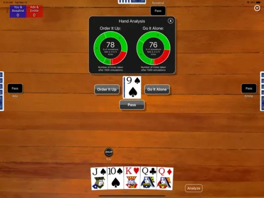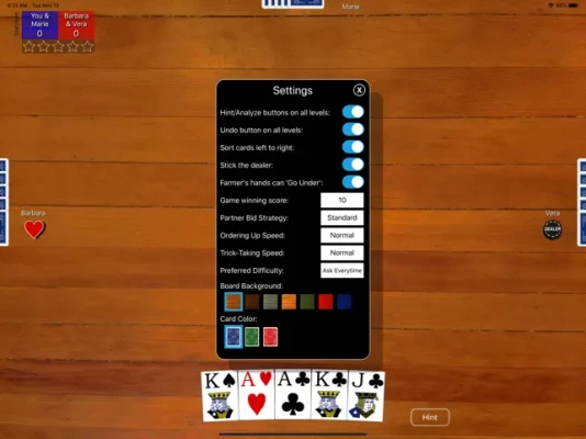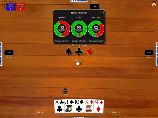 An analyze button can be turned on to help you evaluate your hand and pick a smart bid by simulating thousands of games and showing you likely round score outcomes. A hint button can be turned on to help you see what card the computer pro player would play in your situation. Extensive statistics are kept for wins/losses and success rate in making your bid.