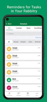Create breeding and litter tasks sequences to get reminders on when to put in a nest box, check for pregnancy, and more, or sync with your favorite calendar app.