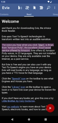 Evie remembers your TTS Engine and Voice preferences per language and switches voices automatically to match the book's language.