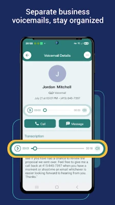 • Organized Voicemail Management: All business voicemails are sent directly to the app with full text transcription. Quickly scan messages on the go while keeping your work and personal communications distinct.