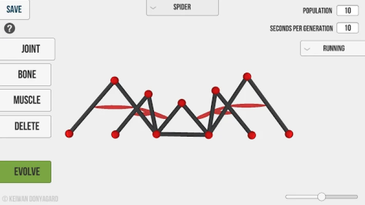 Use joints, bones and muscles to build creatures that are only limited by your imagination. Watch how the combination of a neural network and a genetic algorithm can enable your creatures to "learn" and improve at their given tasks all on their own.