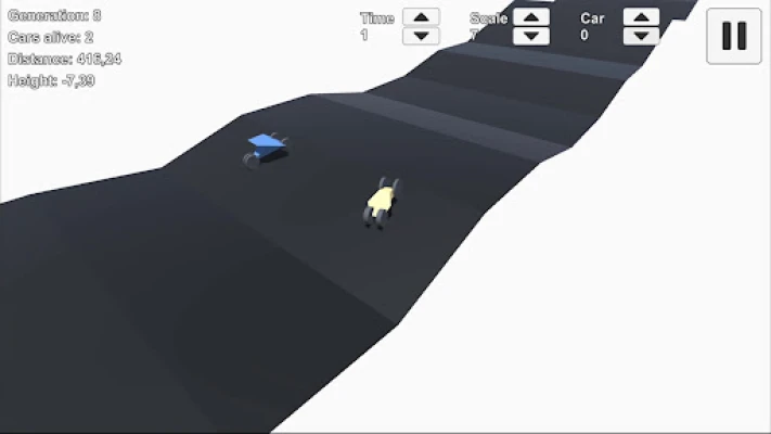 The simulation starts by creating cars with a random genome. Cars drive straight through an abstract terrain (hereinafter referred to as a road). When the car is no longer able to move forward (stuck, turned over or fell off the road), it dies. When all machines are dead, a new generation is created. Each car in a new generation is created by mixing the genomes of two cars from the previous generation. At the same time, the longer distance the car drove in comparison with the others, the more offspring it will leave. The genome of each created car also undergoes mutations with a given probability. As a result of such a model of natural selection, after a certain number of generations, a car will be created that can drive all the way from the beginning to the end.