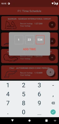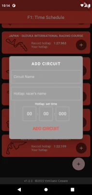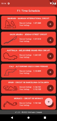 Thanks to this new app you will be able to store your fastest laps in the best F1 circuits and compare them every time lap after lap! Can't find a circuit? Thanks to the function of adding circuits, you can insert a customized circuit to be able to manage the times performed in external circuits. Let's start the engines and enjoy!